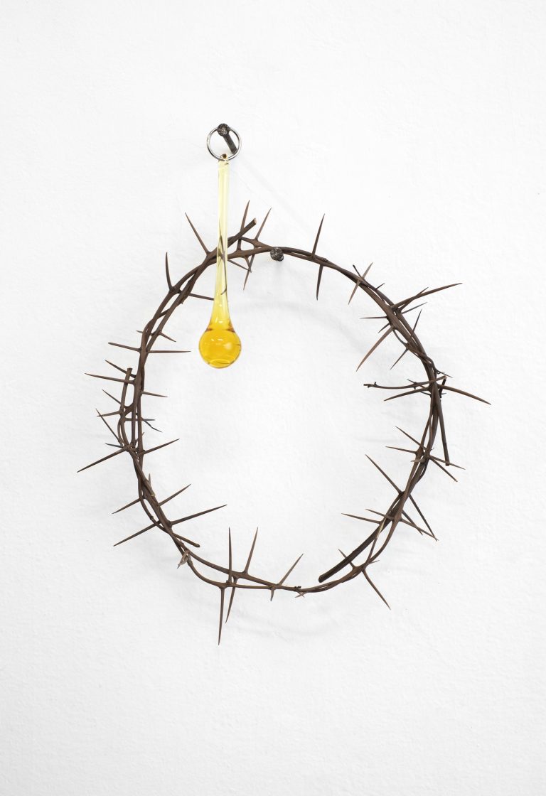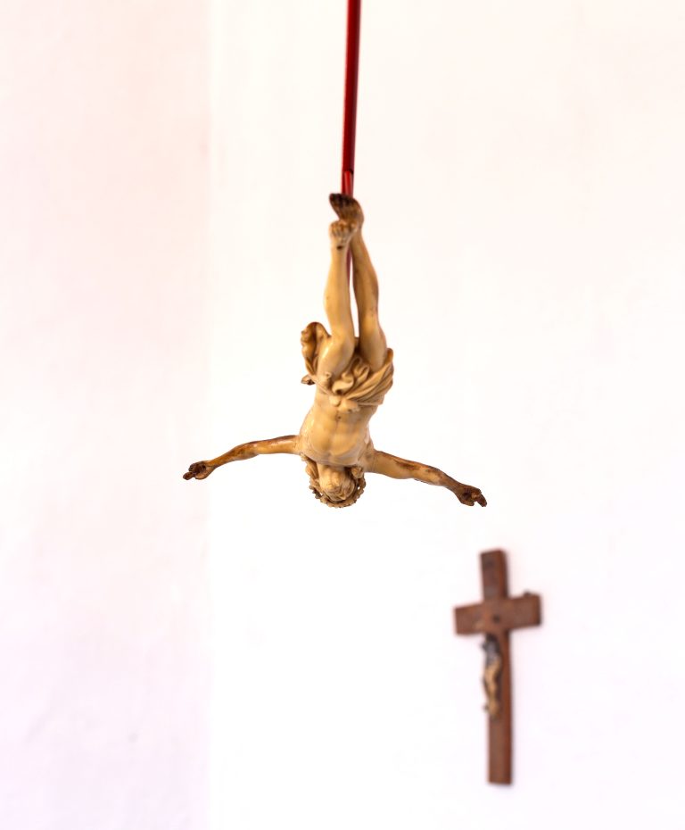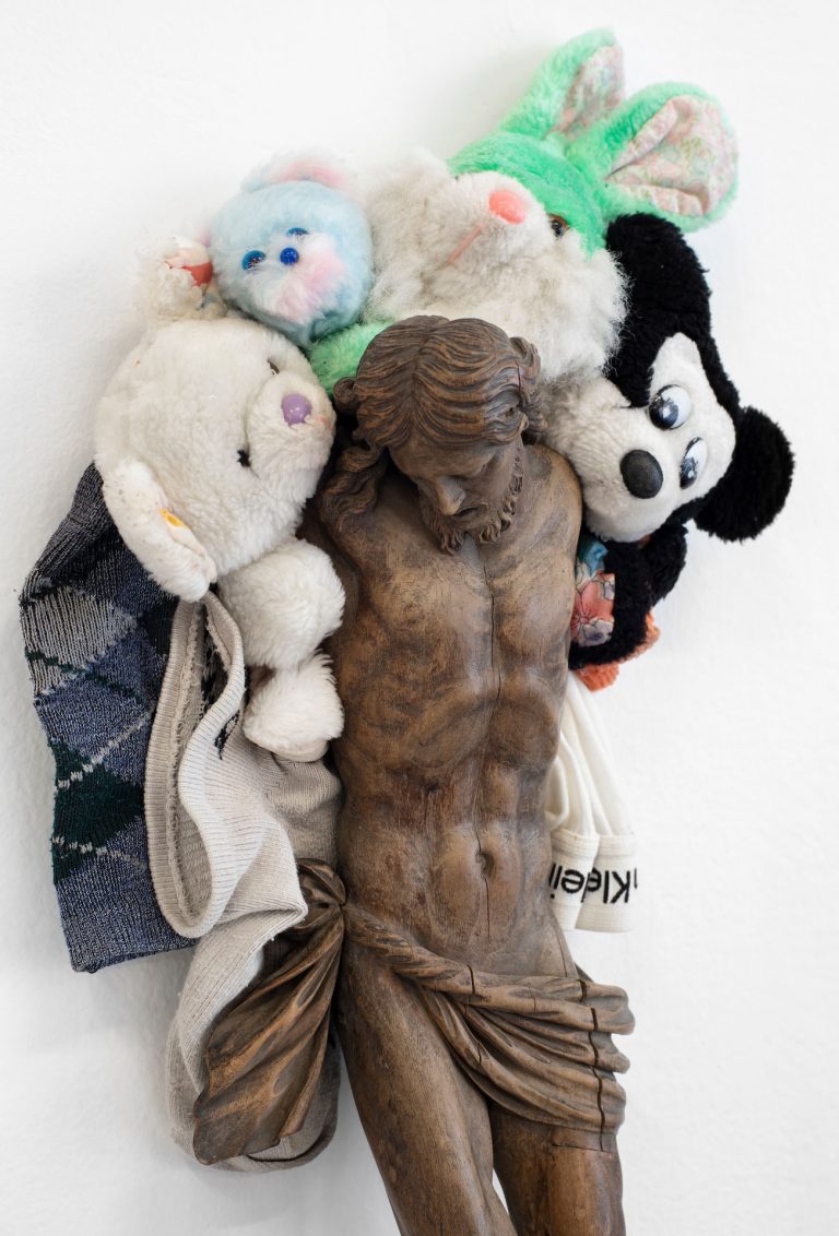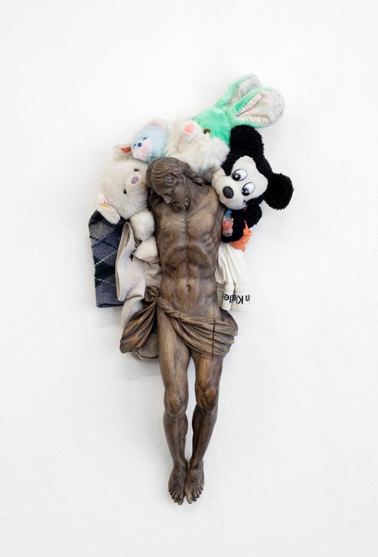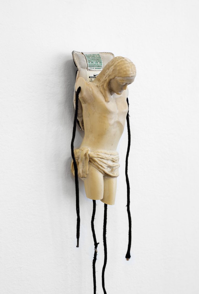 The series includes self-portraits featuring nude Christs arranged among the artist's intimate belongings—stockings, shoes, underwear, pockets, and trouser flies—examining the intersection of homosexuality and faith. Flies detect and feed upon the secretions of a sacred body, while suspended crystals, through their varying hues, represent tears, sweat, urine, and blood.