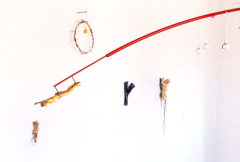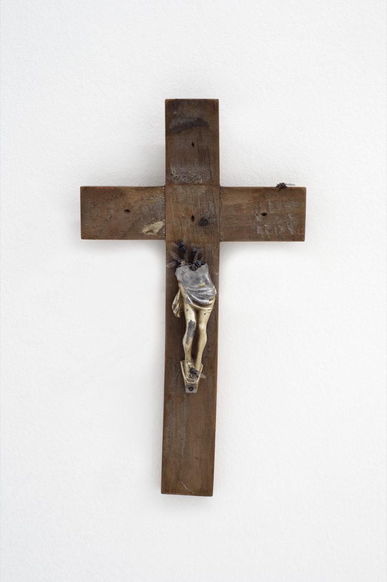 Ocaso (Sunset) encompasses an extensive series of works created by Carlos Herrera between 2001 and 2006. Through collages and objects, the series reimagines the crucified Christ—his naked form, his suffering, and the compassion his punishment evokes. These works meditate on Christ's body: his descent from the cross, his transport, and his final rest in the tomb. They explore the traces he left behind—bodily fluids, sweat, and blood absorbed by the wooden cross, his crown of thorns, and his loincloth (also known as the cloth of purity or perizonium). The works contemplate both the corporeal scent of Christ and humanity's historical objectification of his form.