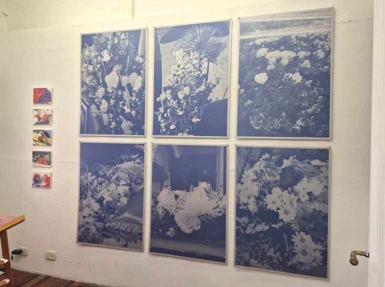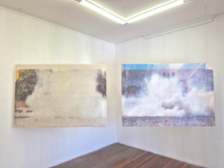 Los testimonios —recogidos, reescritos y situados en un umbral ambiguo entre la oralidad y la literatura— funcionan como contra-documentos: relatos de visiones, descripciones entrecortadas de cuerpos heridos, voces que, al intentar responder a la pregunta “¿qué viste?”, revelan la inestabilidad de la percepción en situaciones extremas. Este archivo verbal se cruza con dos pinturas que retoman la imagen de la nube química —el gas lacrimógeno, en tanto cortina y espectro— y con cinco obras que fijan la superficie del ojo lastimado como campo de inscripción. La pintura se vuelve entonces una forma de darle volumen a lo indescriptible: huellas de dolor, laceraciones delirantes, manchas que desdibujan los límites territoriales del relato.
