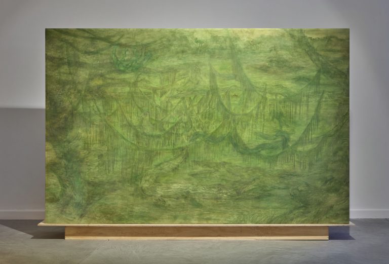 His painting process explores error, the layering of surfaces, and the act of erasure as a creative strategy. Geographical cultural references shape scenes that evoke both real and imaginary landscapes.
