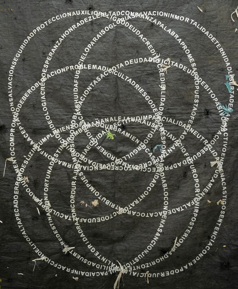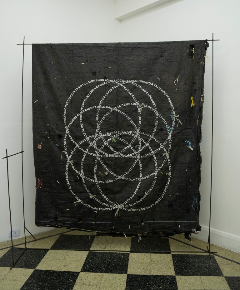 The connection of the art with the Peruvian reality is manifested in the collection of materials in Lima's wholesale markets and the collaboration with the Grados family, Peruvian embroiderers with a long tradition. The resulting work criticizes the system and, when shared, becomes a reason for collective distress. The use of recycled fabrics and their association with velvet symbolize the versatility of Latin American material culture.